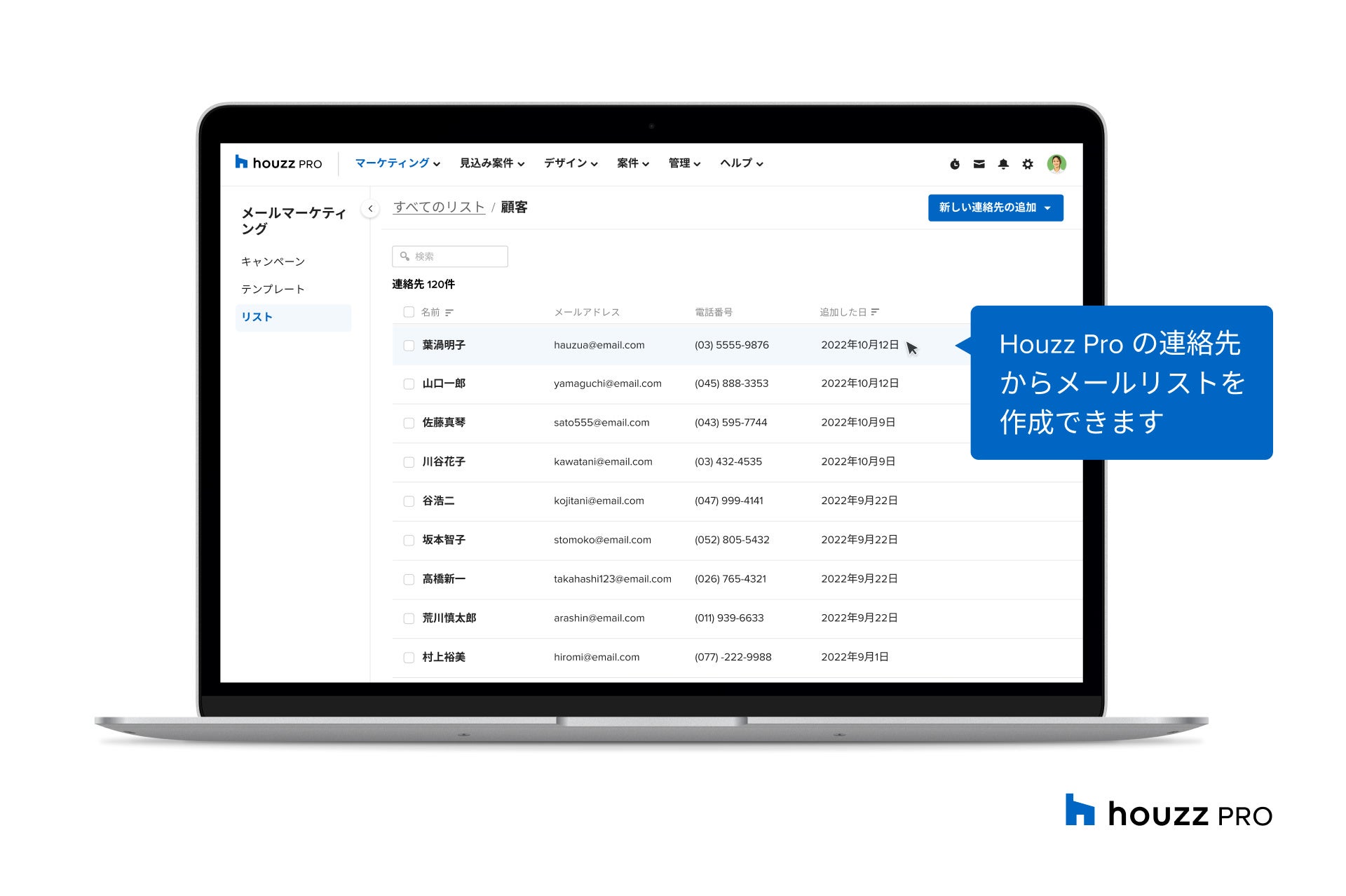 Houzz Pro のメールマーケティング機能の画像はこちら(https://drive.google.com/drive/folders/1HVkd8itLWLo99Uswzn8N3hV8AwnSK_N8)からダウンロードいただけます。